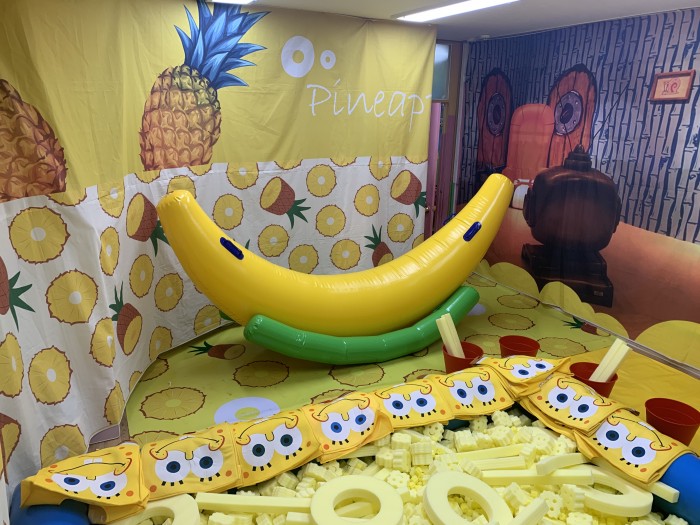 - 스펀지밥 옷을 입고 바나나와 파인애플 속에서 신나게 놀아요. (스티로폼 입니다.)