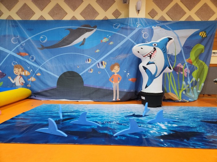 - 상어머리띠를 쓰고 바다 위에서 상어 놀이를 해요.