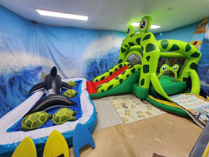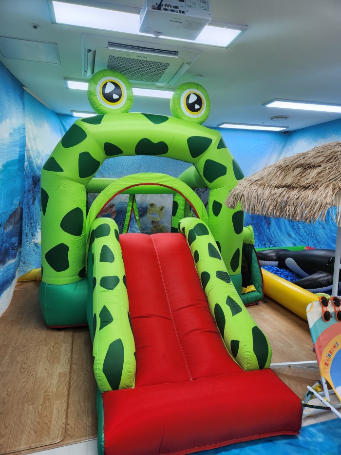 - 개구리 미끄럼틀을 타요. (부딪쳐 다칠 수 있습니다. 1~2명씩 태워주세요.)